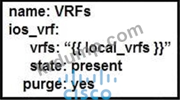 표시된 YAML은 ios_vrf 모듈을 사용하고 있습니다. Ansible 플레이북 워크플로의 일부로 이 작업을 실행할 때 결과는 무엇입니까?
