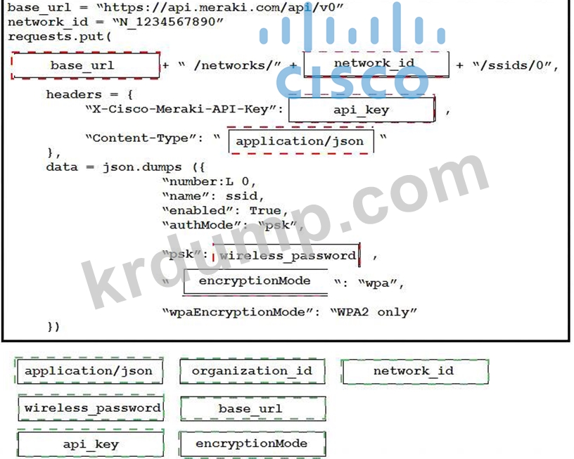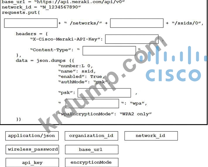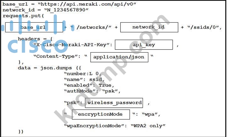 Drag and drop the code onto the snippet to update a SSID in Meraki using the Dashboard API. Not all options are used.