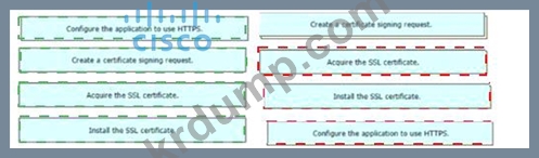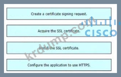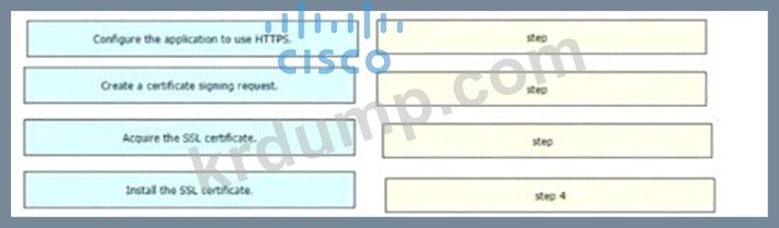 엔지니어가 HR 부서의 중앙 리포지토리로 사용할 웹 기반 애플리케이션을 개발하고 있습니다. 애플리케이션은 사용자 액세스를 인증하고 통신을 암호화해야 합니다. 응용 프로그램 별 SSL 인증서를 설치하려면 왼쪽에서 오른쪽 순서로 단계를 끌어다 놓습니다.