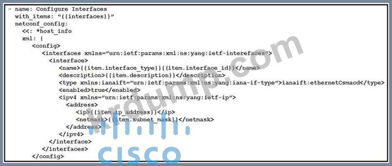 전시회를 참조하십시오. Ansible 플레이북 워크플로의 일부로 netconf_config 모듈을 사용하여 몇 가지 새로운 인터페이스가 구성되고 있습니다. 작업은 장치별로 고유한 인터페이스 변수를 참조합니다.