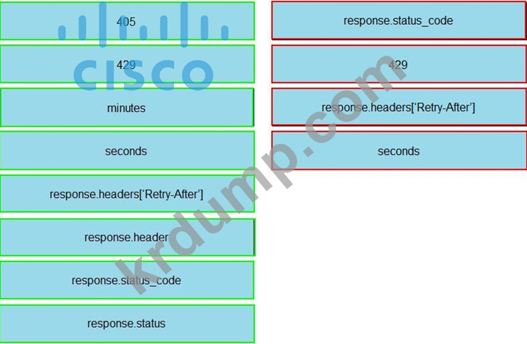 개발자는 Webex Teams REST API를 사용하여 결합된 스페이스를 나열하고, "너무 많은 요청" 응답을 수신한 경우 서버에서 지정한 시간 후에 다시 시도하고, 수신된 다른 오류를 인쇄하기 위해 Python 스크립트를 생성하고 있습니다. 전시회에서 누락된 섹션과 일치하는 오른쪽의 항목 번호로 왼쪽에서 코드 스니펫을 드래그 앤 드롭하여 스크립트를 완성합니다. 모든 코드 스니펫이 사용되는 것은 아닙니다.