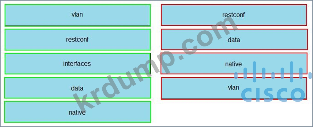 전시회를 참조하십시오. 이 YANG 모델이 주어진 VLAN 구성을 쿼리하기 위해 적절한 RESTCONF URL을 생성하기 위해 URL의 일부를 왼쪽에서 오른쪽의 항목 번호로 드래그 앤 드롭하여 전시회에서 누락된 섹션과 일치합니다. 모든 URL 부분이 사용되는 것은 아닙니다.