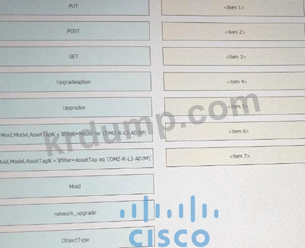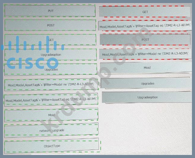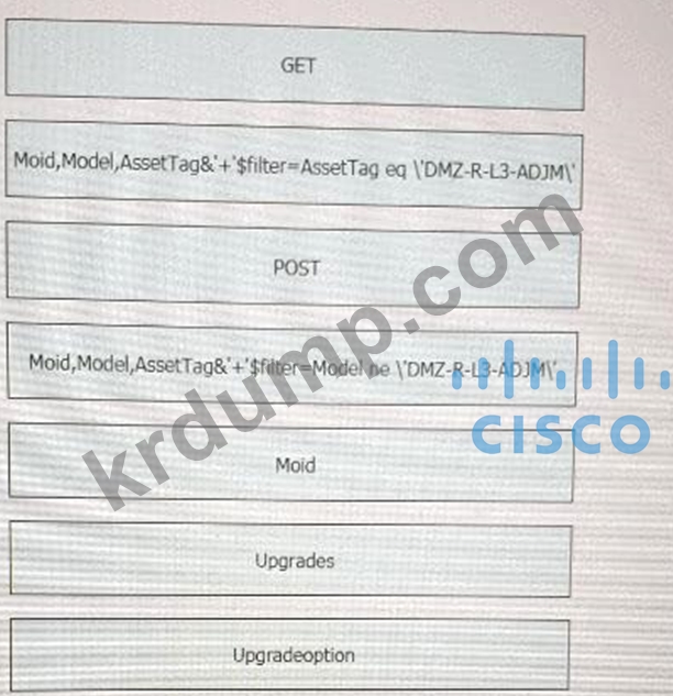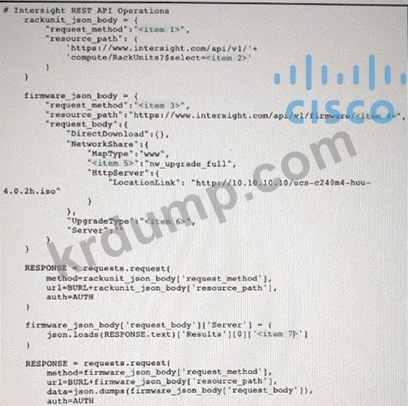 위의 전시회를 참조하고 왼쪽 상단 모서리에 있는 리소스 탭을 클릭하면 이 질문에 도움이 되는 리소스를 볼 수 있습니다. 이 스크립트는 CiscoIntersight REST API를 사용합니다. 특정 Cisco Intersight USC 랙 서버 DMZ_R-L3-ADJM에서 펌웨어를 업데이트하기 위해 Python 스크립트에서 누락된 섹션을 일치시키기 위해 왼쪽에서 오른쪽에 있는 항목 번호로 코드 스니펫을 끌어다 놓습니다. 모든 코드 스니펫이 사용되는 것은 아닙니다.