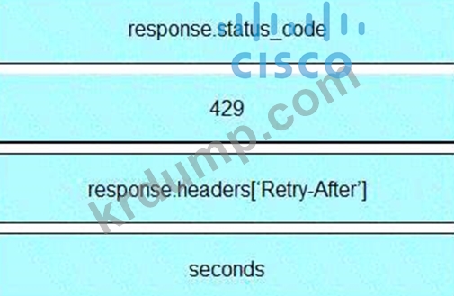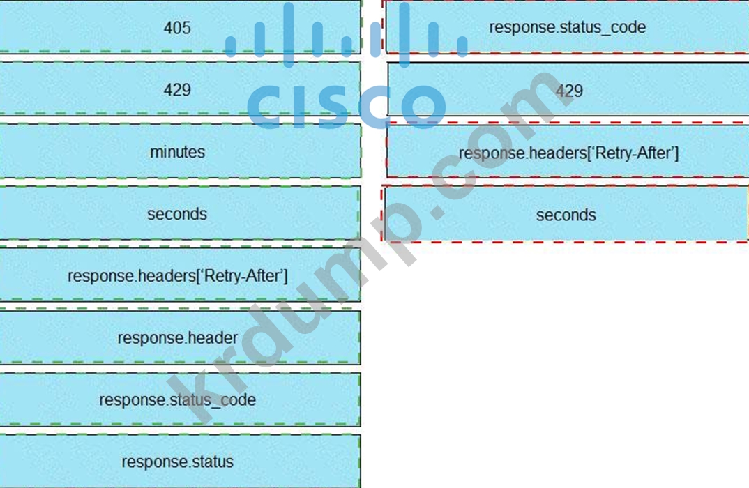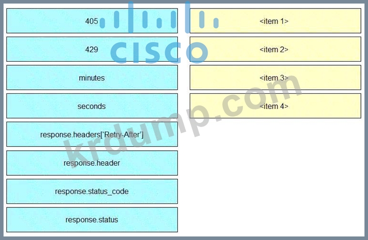 개발자는 Webex Teams REST API를 사용하여 결합된 스페이스를 나열하고, "너무 많은 요청" 응답을 수신한 경우 서버에서 지정한 시간 후에 다시 시도하고, 수신된 다른 오류를 인쇄하기 위해 Python 스크립트를 생성하고 있습니다. 전시회에서 누락된 섹션과 일치하는 오른쪽의 항목 번호로 왼쪽에서 코드 스니펫을 드래그 앤 드롭하여 스크립트를 완성합니다. 모든 코드 스니펫이 사용되는 것은 아닙니다.