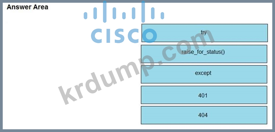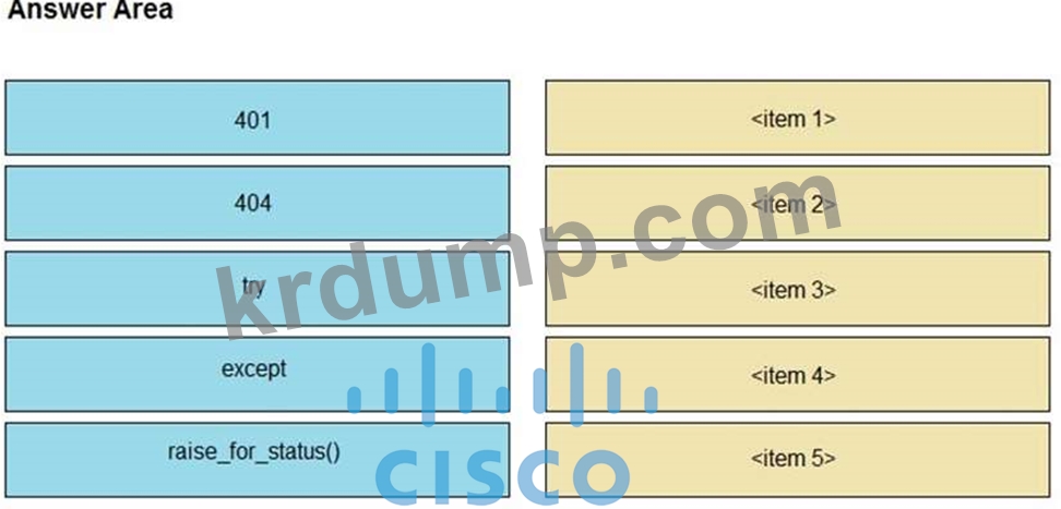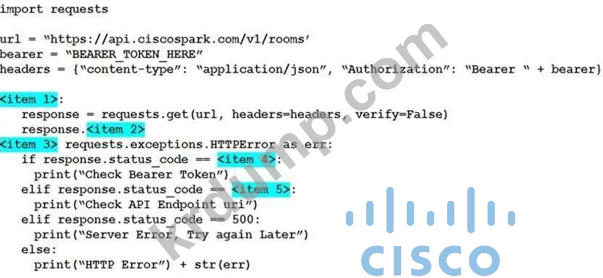 개발자는 Webex Teams REST API를 사용하여 결합된 스페이스를 나열하고 수신하는 오류를 정상적으로 처리 및 인쇄하기 위해 Python 스크립트를 만들고 있습니다. 전시회에서 누락된 섹션과 일치하는 오른쪽의 항목 번호로 왼쪽에서 코드 스니펫을 드래그 앤 드롭하여 스크립트를 완성합니다.