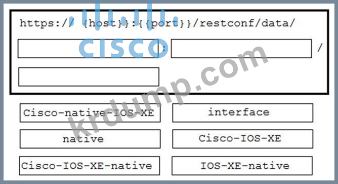 네트워크 엔지니어는 Cisco IOS XE YANG 모델을 사용하여 인터페이스 데이터를 검색해야 합니다. RESTCONF URI를 완료하려면 코드가 누락된 상자로 구성요소를 아래에서 끌어다 놓으십시오. 모든 옵션이 사용되는 것은 아닙니다.