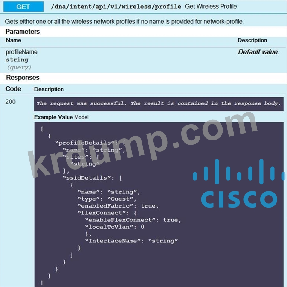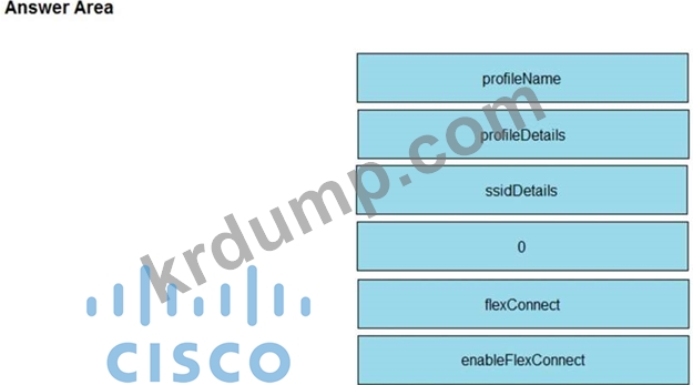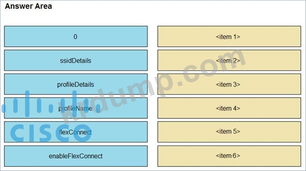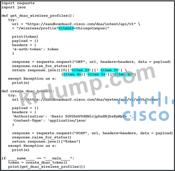 전시회를 참조하십시오. Python 스크립트는 "ChicagoCampus"에 대한 무선 프로파일을 쿼리한 다음 활성화 FlexConnect 값을 구문 분석하는 Cisco DNA Center에 대한 API 호출을 수행해야 합니다. 전시회에서 누락된 섹션과 일치하는 오른쪽의 항목 번호로 왼쪽의 Python 코드 부분을 끌어다 놓습니다.