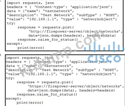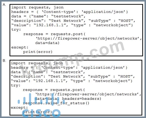 전시회를 참조하십시오. 개발자는 Cisco Firepower Device Management API를 사용하여 testnetwork라는 새 네트워크 개체를 생성해야 합니다. 또한 스크립트는 요청 중에 발생하는 모든 예외를 처리하고 결과 오류를 출력해야 합니다. 어떤 스크립트를 사용해야 합니까?