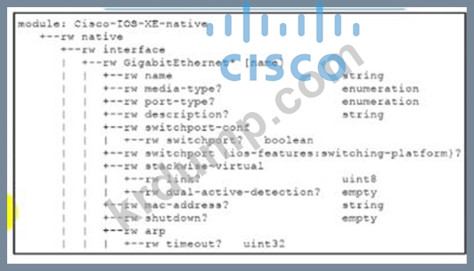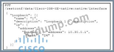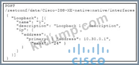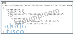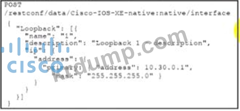 RESTCONF를 사용하여 Cisco IOS XE 장치에서 IP 주소 10.30.0.1/24로 Interface Lookback 1을 생성해야 합니다. 전시회에서 정의한 스키마를 사용해야 합니다. 이 작업에 사용해야 하는 본문 및 URI는 무엇입니까?