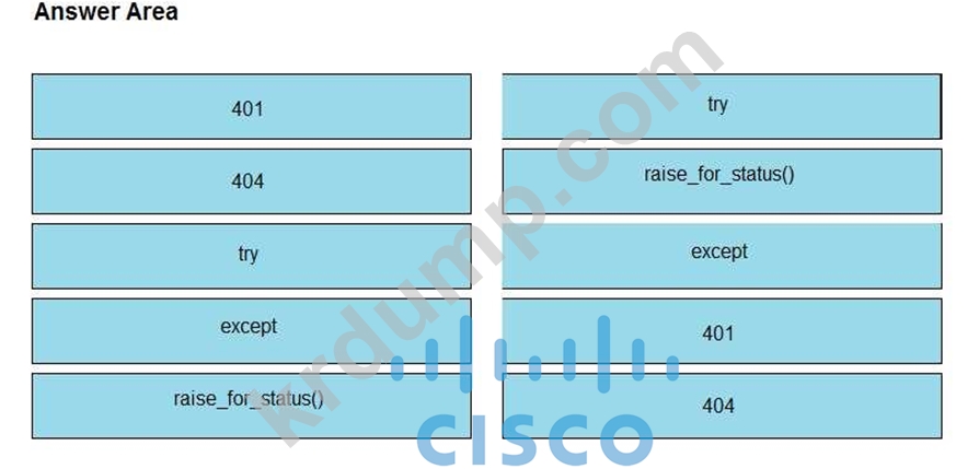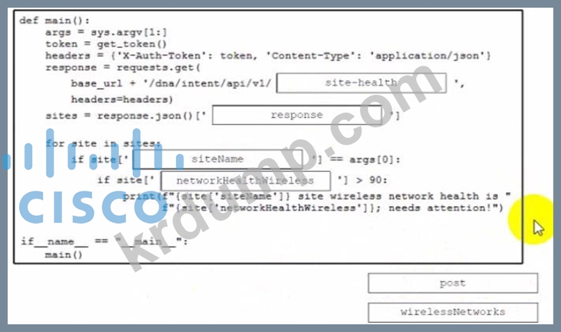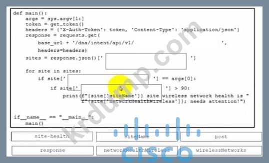 사이트의 Cisco DNA Center 무선 네트워크 상태가 90% 이하인 경우 메시지를 인쇄하는 Python 스크립트를 구성하려면 하단에서 코드가 누락된 상자로 코드를 끌어다 놓습니다. REST API의 GET 방식을 사용하여 무선 네트워크 장치에서 정보를 수집합니다. 모든 옵션이 사용되는 것은 아닙니다.
