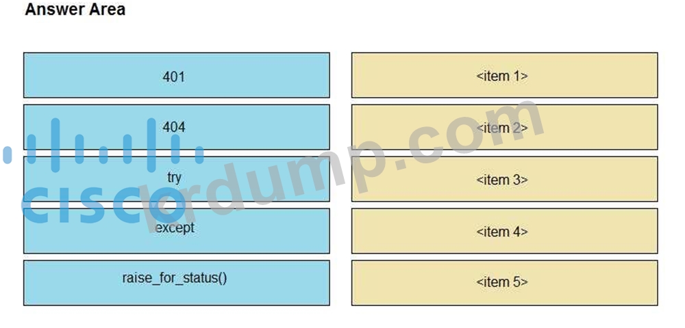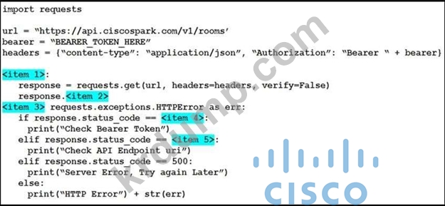 A developer is creating a Python script to use the Webex Teams REST API to list joined spaces, and gracefully handle and print the errors it receives. Drag and drop the code snippets from the left onto the item numbers on the right that match the missing sections in the exhibit to complete the script.