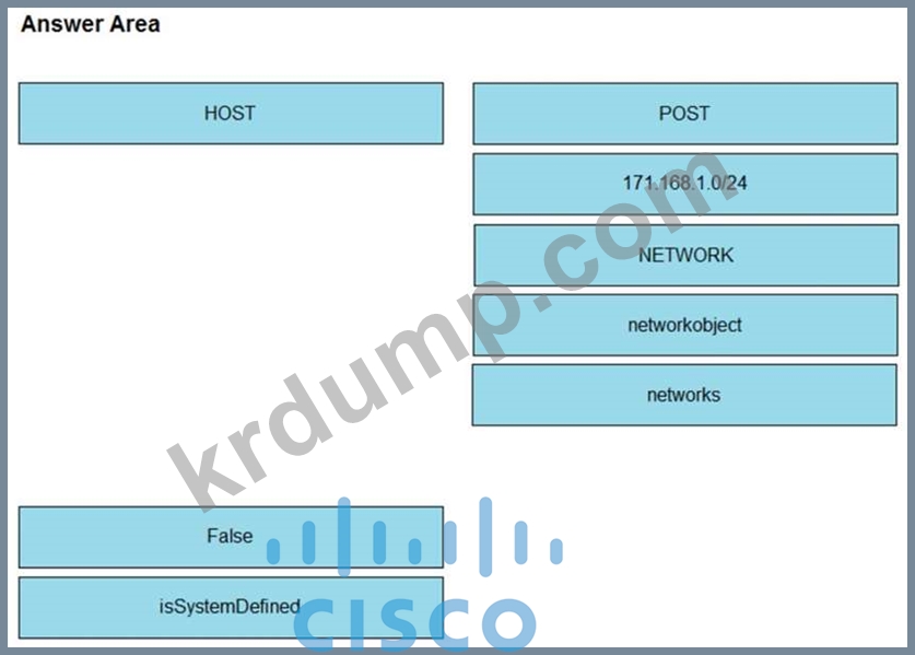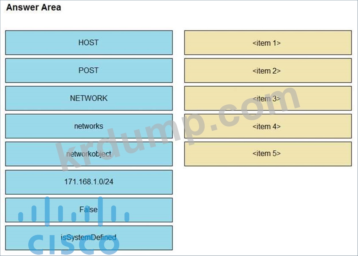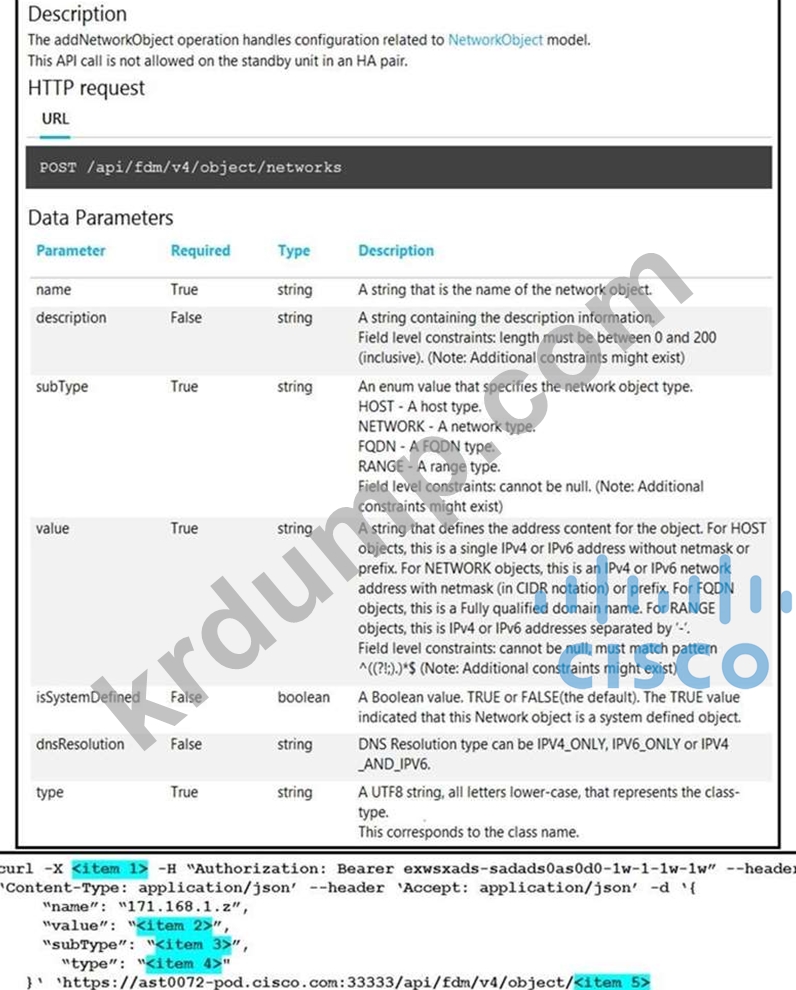 전시회를 참조하십시오. 개체를 생성하기 위해 FirePower Device Manager API에 대한 cURL 요청을 완료하려면 왼쪽에서 cURL 전시회의 누락된 섹션과 일치하는 오른쪽의 항목 번호로 코드 스니펫을 끌어다 놓습니다. 모든 코드 스니펫이 사용되는 것은 아닙니다.