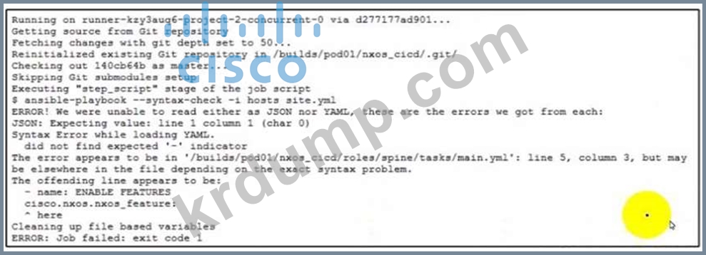 네트워크 엔지니어가 Ansible 플레이북을 개발하여 GitLab에 커밋했습니다. GitLab CI 파이프라인이 시작되었지만 즉시 실패합니다. 이슈가 뭐야?