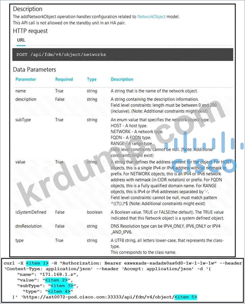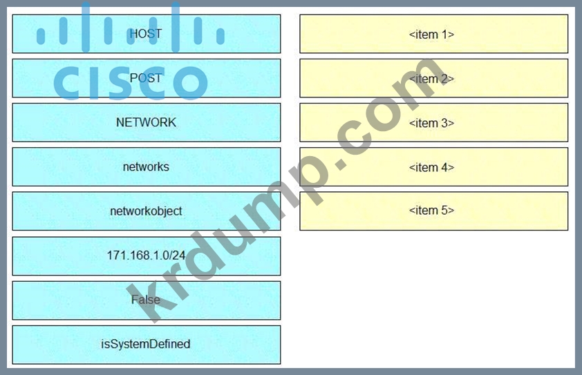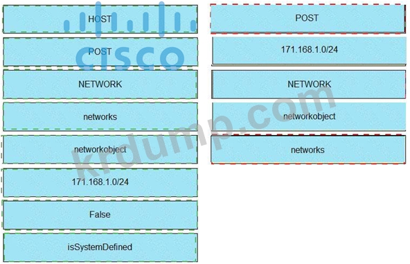 개체를 생성하기 위해 FirePower Device Manager API에 대한 cURL 요청을 완료하려면 왼쪽에서 cURL 전시회의 누락된 섹션과 일치하는 오른쪽의 항목 번호로 코드 스니펫을 끌어다 놓습니다. 모든 코드 스니펫이 사용되는 것은 아닙니다.