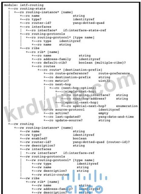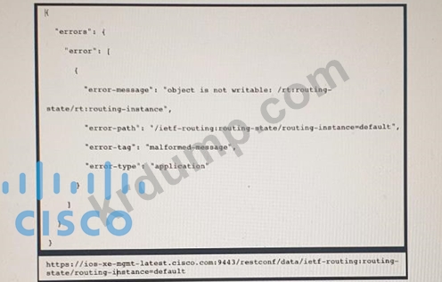 위의 전시회를 참조하고 왼쪽 상단 모서리에 있는 IETF 라우팅 탭을 클릭하면 이 질문에 대한 도움을 받을 수 있습니다. 개발자가 전시회의 URL을 사용하여 경로 목록에 새 경로를 추가하여 라우팅 인스턴스를 업데이트 하려고 합니다 . 수신되는 오류를 수정하려면 어떤 조치를 취해야 합니까?