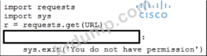 네트워크 엔지니어는 사용자가 인증 및 권한이 있더라도 리소스에 액세스할 수 있는 권한이 없을 때 요청에서 API 오류를 처리해야 합니다. 이러한 API 오류를 처리하기 위해 코드가 누락된 스니펫에 어떤 코드 줄을 배치해야 합니까?