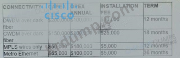 고객이 두 프로덕션 데이터 센터 간의 DCI 연결 옵션을 조사합니다. 솔루션은 1일 차 작업에 대해 단일 장애 지점이 없는 위치 간에 이중 10G 연결을 제공해야 합니다. 또한 격리된 SAN over IP 및 격리된 전용 복제 IP 회로를 수용하기 위해 두 번째 해에 최대 20개의 탄력적 연결을 확장할 수 있는 옵션도 포함해야 합니다. 모든 연결 방법은 이중 10Gbps입니다. 시나리오에서 2년 동안 비용이 가장 적게 드는 운송 기술은 무엇입니까?