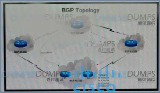 엔지니어는 AS 500에서 오는 AS 111로 가는 트래픽 흐름을 재설계하라는 요청을 받았습니다. AS 111 네트워크 91 7 0.0/16으로 향하는 트래픽은 AS 100을 통해 들어와야 합니다. 반면 AS의 다른 모든 네트워크로 향하는 트래픽은
