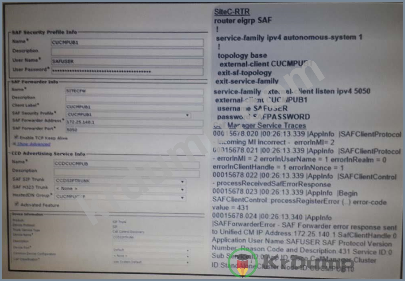 Refer to the exhibit. A collaboration engineer using the Show eigrp service-family External-client IOS command, noticed that a CUCM failed to register as an external SAF Client on Cisco IOS router named Site CRTR. The engineer has collected snippets of the IOS configuration screenshots and CUCM trace shown in the exhibit.