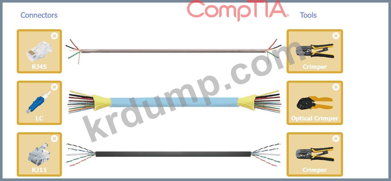 기술자가 Cat 6 케이블에 RJ45 커넥터를 설치하고 있습니다. 기술자는 다음 중 어떤 도구를 사용하여 커넥터를 고정해야 합니까?