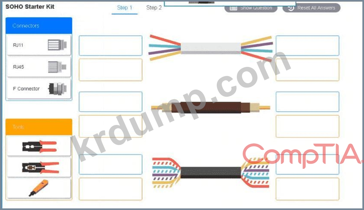 적절한 케이블, 케이블 끝, 도구 및 장비를 사용하여 네트워크를 구성하고 구성 요소를 그에 따라 연결합니다. 3단계로 구성되며 시뮬레이션은 1단계부터 시작합니다.