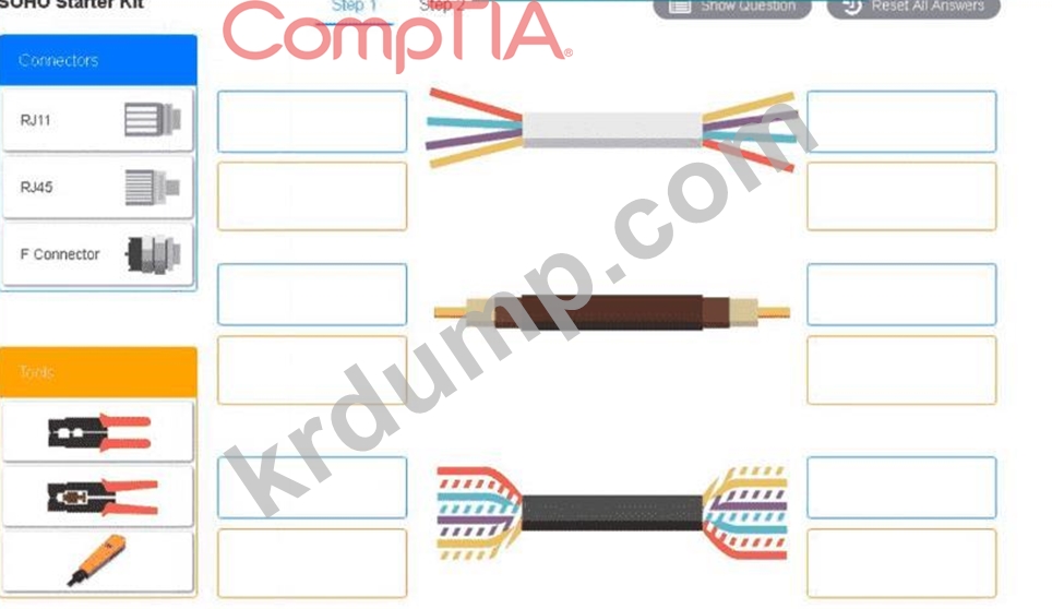적절한 케이블, 케이블 끝, 도구 및 장비를 사용하여 네트워크를 구성하고 구성 요소를 적절하게 연결합니다. 3단계로 구성되며 시뮬레이션은 1단계에서 시작합니다.