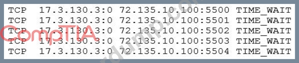 웹 서버가 공용 IaaS 공급자에 배포되었으며 공용 IP 주소 72.135.10.100이 할당되었습니다. 사용자는 이제 웹 사이트를 탐색할 때 서비스를 사용할 수 없다는 메시지를 수신한다고 보고하고 있습니다. 클라우드 관리자는 서버에 로그인하고 netstat 명령을 실행하고 다음과 같은 관련 출력을 확인합니다.