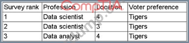 데이터 과학자가 국가 마스코트 투표 결과를 예측하는 모델을 개발하고 있습니다. 호랑이와 사자 중 하나를 선택해야 합니다. 전체 데이터 세트는 17개 직업과 12개 지역을 대표하는 개인들의 피드백을 나타냅니다. 다음 순위 집계는 데이터 세트의 80%를 나타냅니다.