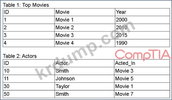 한 영화 제작사가 아래 표의 데이터를 사용하여 인기 영화에 출연한 배우들을 찾고자 합니다. 결과 데이터는 표 1의 모든 영화와 표 2에 나열된 배우들을 포함해야 합니다.
