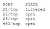 분석가가 관리 팀을 위한 보안 보고서를 생성하고 있습니다. 보안 지침에서는 모든 수신 대기 중인 암호화되지 않은 서비스를 비활성화할 것을 권장합니다. Nmap의 이 출력이 제공됩니다.