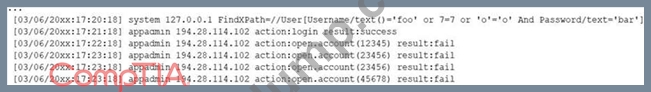 보안 분석가는 공격의 조기 탐지에만 사용되는 appadmin 테스트 계정에 누군가 로그인했다는 SIEM 경고를 받습니다. 그런 다음 보안 분석가는 다음 애플리케이션 로그를 검토합니다.