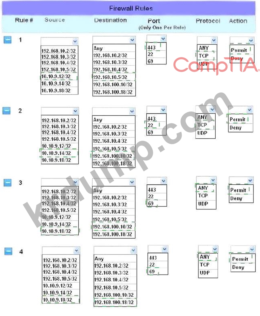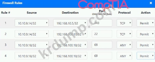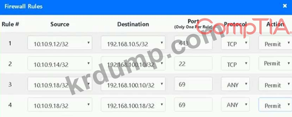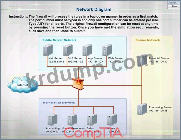 지침: 방화벽은 처음 일치하는 순서대로 하향식 방식으로 규칙을 처리합니다. 포트 번호를 입력해야 하며 모든 포트에 대해 ANY 유형 규칙당 하나의 포트 번호만 입력할 수 있습니다. 원래 방화벽 구성은 재설정 버튼을 눌러 언제든지 재설정할 수 있습니다. 시뮬레이션 요구 사항을 충족하면 저장을 클릭한 다음 완료를 클릭하여 제출합니다.