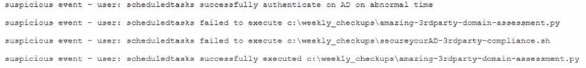 주니어 보안 분석가가 사용자 상호 작용 없이 여러 계정에서 암호가 변경된 후 분석을 수행하고 있습니다. SIEM에는 다음 텍스트가 포함된 여러 logtn 엔터티가 있습니다.