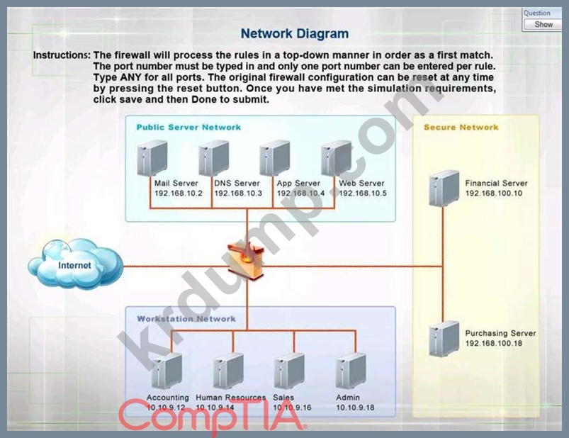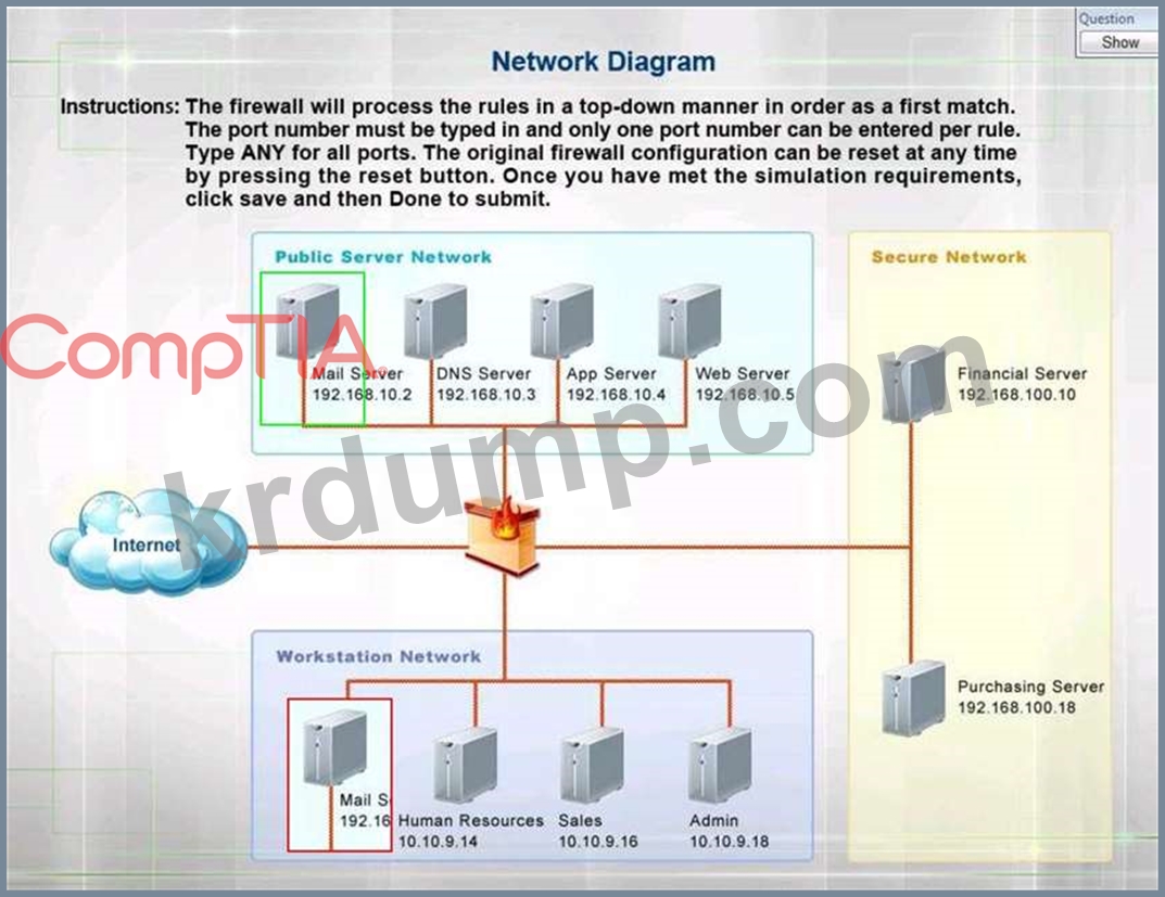 지침: 방화벽은 처음 일치하는 순서대로 하향식 방식으로 규칙을 처리합니다. 포트 번호를 입력해야 하며 모든 포트에 대해 ANY 유형 규칙당 하나의 포트 번호만 입력할 수 있습니다. 원래 방화벽 구성은 재설정 버튼을 눌러 언제든지 재설정할 수 있습니다. 시뮬레이션 요구 사항을 충족하면 저장을 클릭한 다음 완료를 클릭하여 제출합니다.