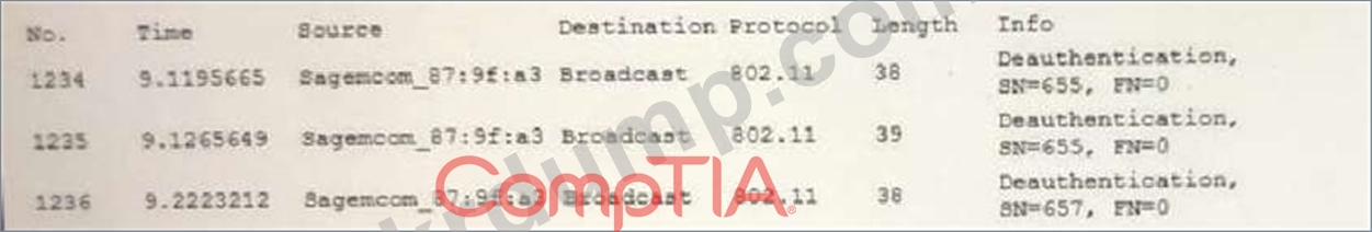 사용자가 지역 커피숍에서 작업할 때 무선 네트워크의 지속적인 지연 및 성능 문제를 보고합니다. 보안 분석가는 사용자에게 Wireshark 설치 과정을 안내하고 분석할 5분 pcap을 얻습니다. 분석가는 다음 출력을 관찰합니다.