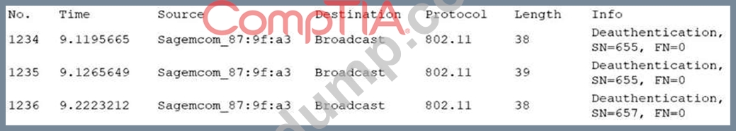 사용자가 지역 커피숍에서 작업할 때 무선 네트워크의 지속적인 지연 및 성능 문제를 보고합니다. 보안 분석가가 사용자에게 Wireshark 설치 과정을 안내하고 5분 동안 분석할 수 있는 PCAP를 얻습니다. 분석가는 다음 결과를 관찰합니다.