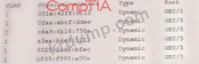보안 관리자가 네트워크 스위치 테이블을 확인하면 다음과 같은 출력이 표시됩니다.