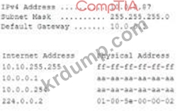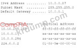 네트워크 분석가가 침해된 기업 정보를 조사하고 있습니다. 분석가는 네트워크 트래픽이 인터넷으로 전송되기 전에 가로채기되었을 것이라는 가설을 세웠습니다. 다음은 내부 호스트에서 캡처된 출력입니다.
