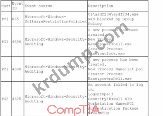 보안 분석가는 공격자가 손상된 노트북에서 어떤 작업을 할 수 있었는지 파악하기 위해 사고를 조사하고 있습니다. 분석가는 다음 SIEM 로그를 검토합니다.