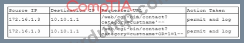 보안 분석가가 IP 주소 10.10.1.1에 위치한 웹 서버에서 의심스러운 트래픽을 조사하고 있습니다. WAF 로그를 검색한 결과 다음과 같은 결과가 나타났습니다.