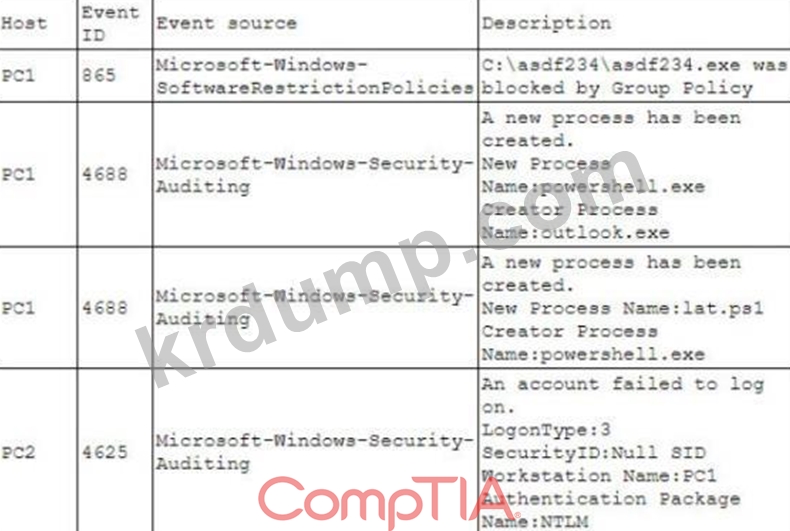 보안 분석가는 공격자가 손상된 노트북에서 어떤 작업을 할 수 있었는지 확인하기 위해 사고를 조사하고 있습니다. 분석가는 다음 SIEM 로그를 검토합니다.