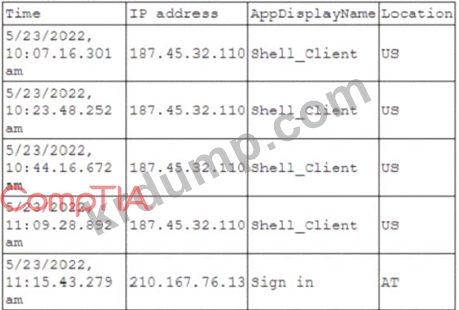 보안 관리자는 다음과 같은 로그 활동이 있는 사용자 계정에 대한 알림을 받았습니다.