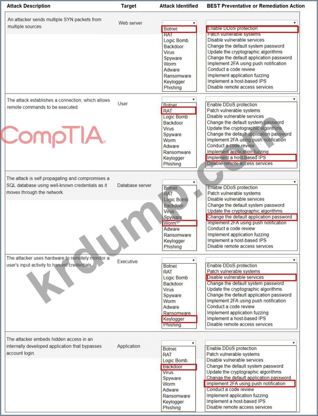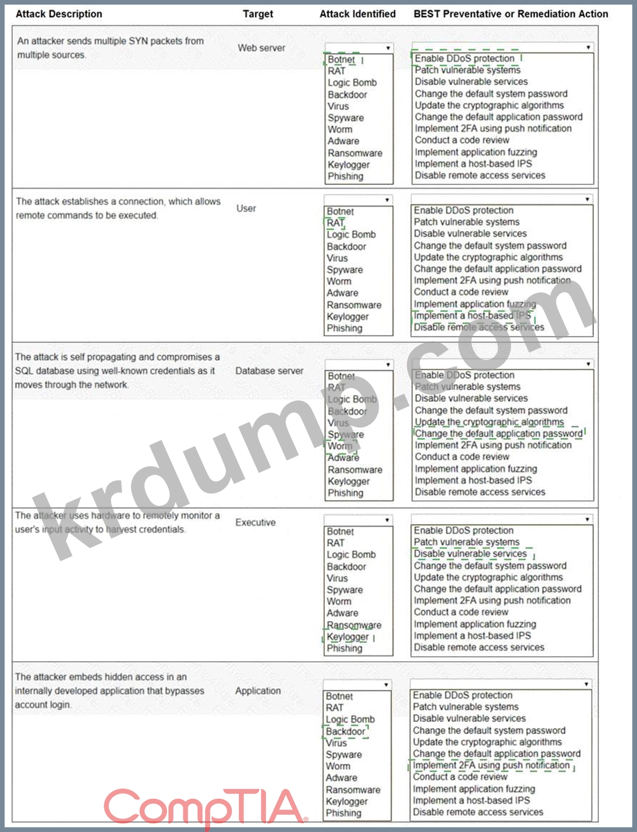 각 드롭다운 목록에서 적절한 공격과 해결 방법을 선택하여 해당 공격에 해결 방법을 라벨로 표시합니다.