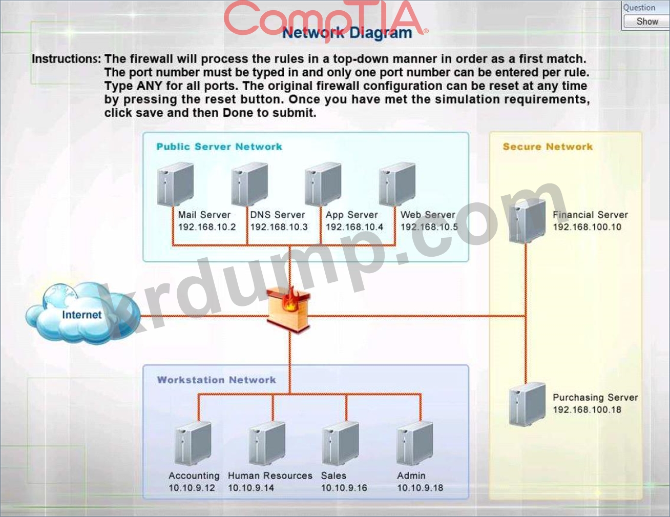 지침: 방화벽은 첫 번째 일치 항목부터 하향식으로 규칙을 처리합니다. 포트 번호는 반드시 입력해야 하며, 규칙당 하나의 포트 번호만 입력할 수 있습니다. 모든 포트에 대해 "ANY"를 입력하십시오. 재설정 버튼을 눌러 언제든지 원래 방화벽 구성을 재설정할 수 있습니다. 시뮬레이션 요구 사항을 충족하면 "저장"을 클릭한 다음 "완료"를 클릭하여 제출하십시오.