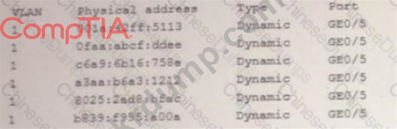 보안 관리자가 네트워크 스위치 테이블을 확인했는데, 다음과 같은 출력이 표시됩니다.