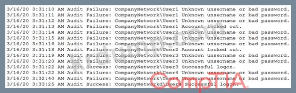 보안 분석가는 공격자가 User3를 이용하여 회사 네트워크 내에 발판을 마련한 방법을 파악해야 합니다. 회사의 계정 잠금 정책에 따라 3회 시도 실패 시 최소 15분 동안 계정이 잠기도록 되어 있습니다.