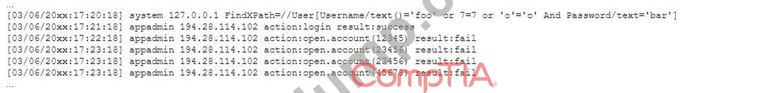 보안 분석가는 누군가 공격 조기 탐지에만 사용되는 appadmin 테스트 계정에 로그인했다는 SIEM 알림을 받습니다. 그런 다음 보안 분석가는 다음 애플리케이션 로그를 검토합니다.