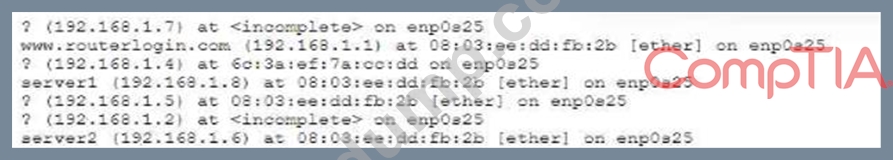 보안 관리자가 서브넷에서 발생하는 의심스러운 네트워크 활동에 대한 보고서를 검토하고 있습니다. 네트워크 사용자들은 다양한 웹사이트 연결이 간헐적으로 발생한다고 보고합니다. 관리자는 워크스테이션에 로그인하여 다음 명령 출력을 검토합니다.
