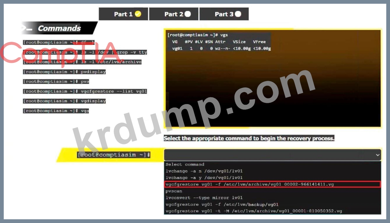출력을 검토하고 적절한 명령을 선택하여 복구 프로세스를 시작하세요.
