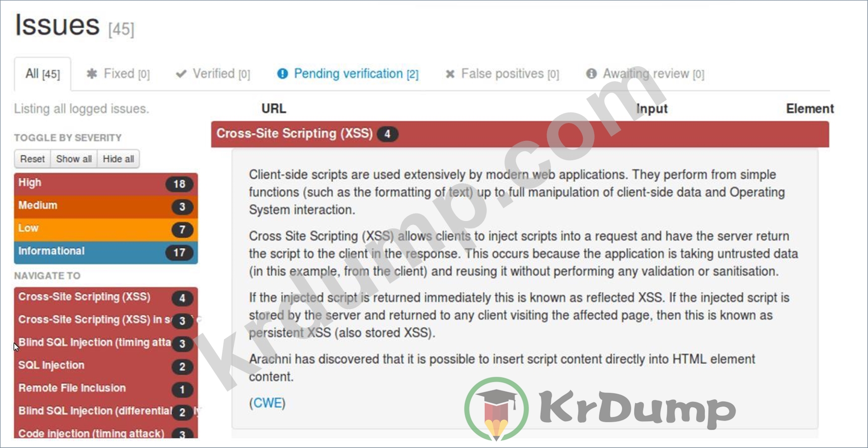 보안 분석가는 PII 데이터를 저장하는 웹 애플리케이션에 대한 다음 Arachni 스캔 결과를 검토합니다.
